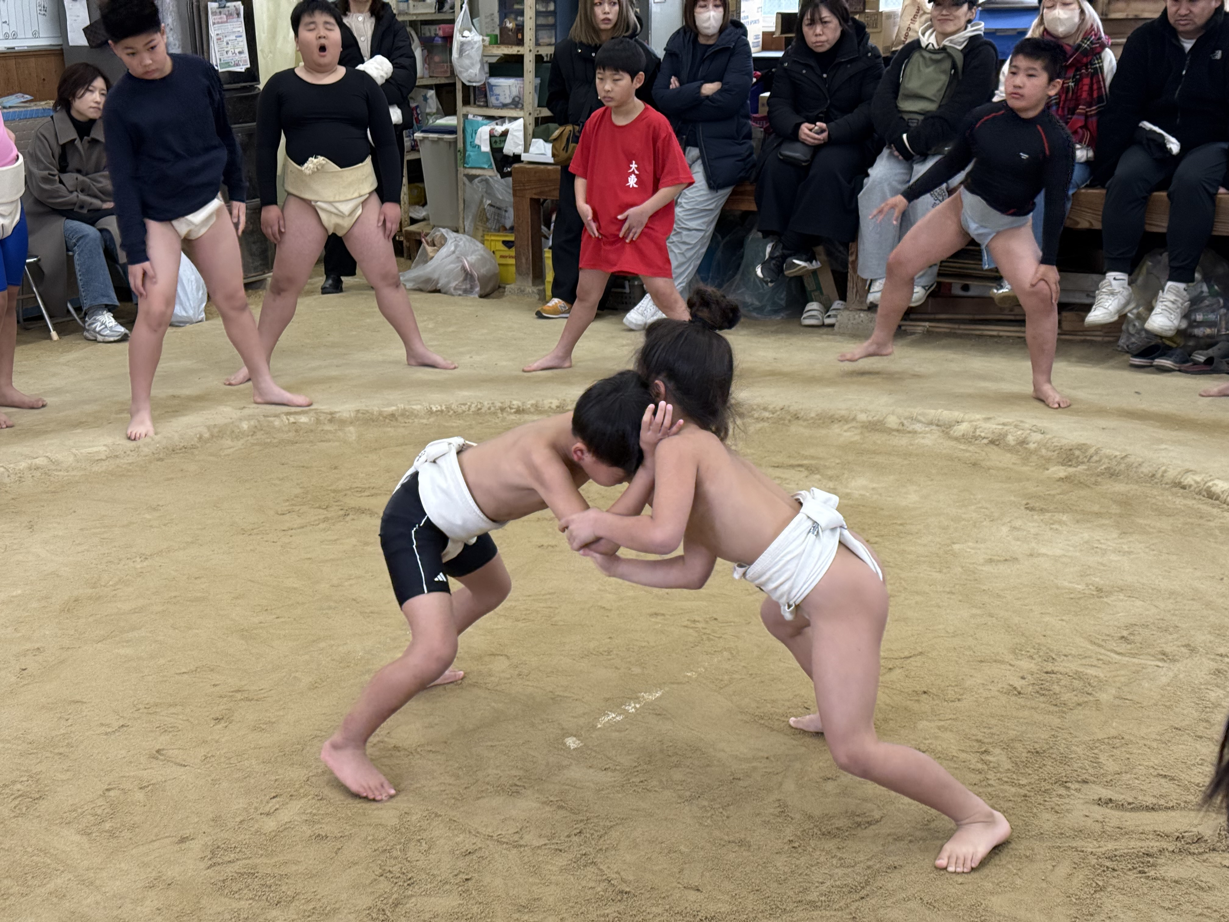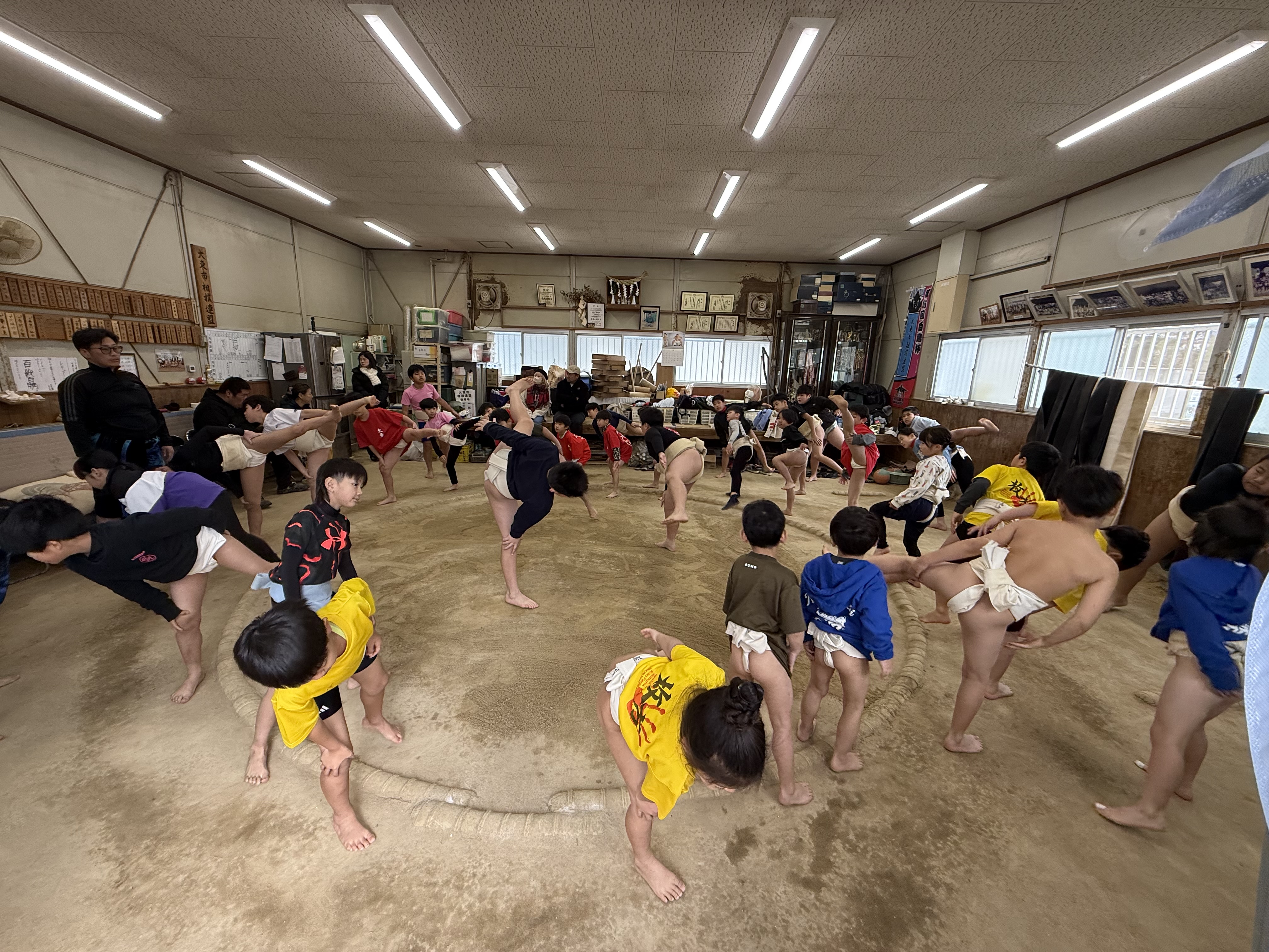 屋内土俵は全員の四股に始まり、基本動作のトレーニングを通して身体を解し、学年が低い順に取組を進めていきました。